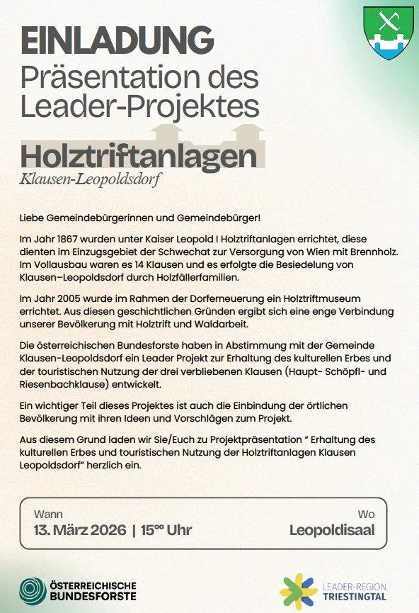 Auf Initiative unseres geschäftsführenden Gemeinderats und LEADER-Beauftragten der Gemeinde Dr. Ernst Eder haben die Österreichischen Bundesforste mit der Gemeinde ein LEADER-Projekt zur Erhaltung des kulturellen Erbes und der touristischen Nutzung unserer drei verbliebenen Klausen - Haupt-, Schöpfl- und Riesenbachklause - entwickelt. Ebenfalls eingebunden in das Projekt soll unseres Holztriftmuseum werden.